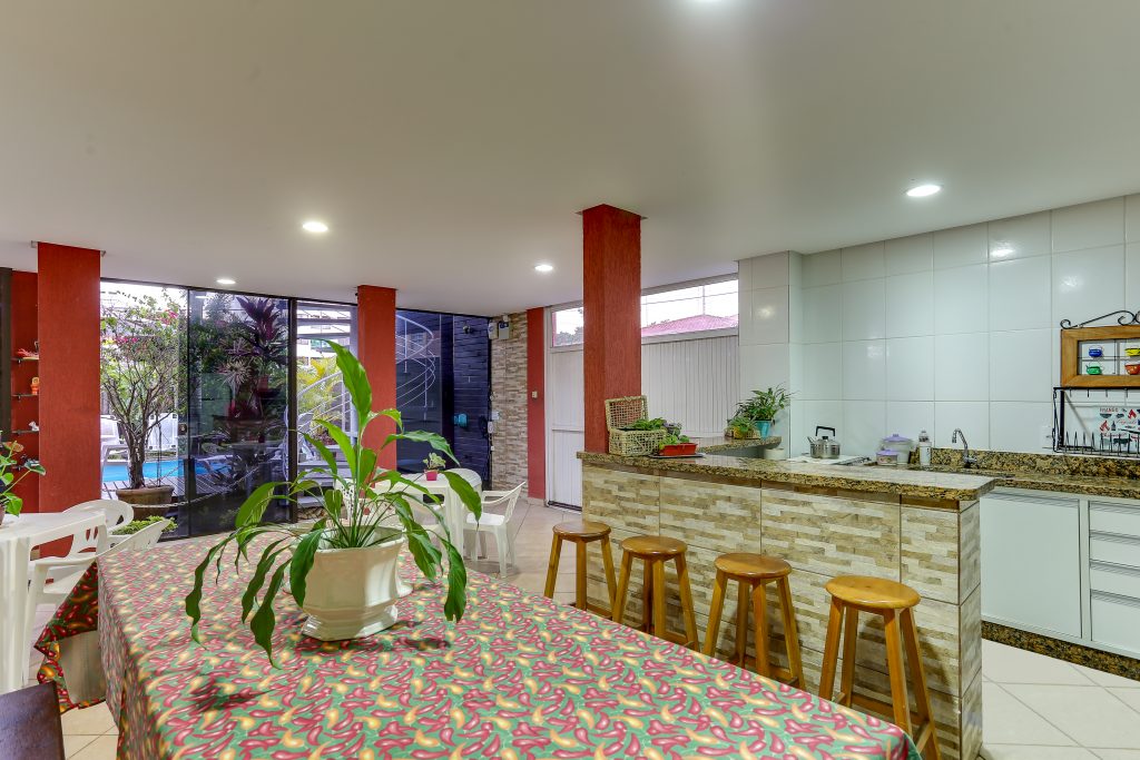 Um salão amplo, composto por uma cozinha completa, freezer, churrasqueira, TV de 50’com TV a Cabo, mesas e cadeiras para acomodar até 20 pessoas. Localizada em frente a piscina e jardins. Ótimo ambiente para proporcionar momentos agradáveis para sua família e amigos.